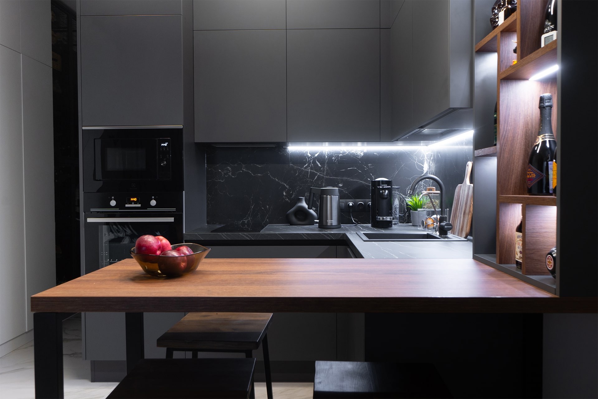 • Они помогают зонировать пространство. Черный цвет позволяет выделить зону приготовления пищи в кухне-гостиной или студии, а столешница под древесину может стать своего рода связующим элементом с другими деталями интерьера в зоне отдыха.
