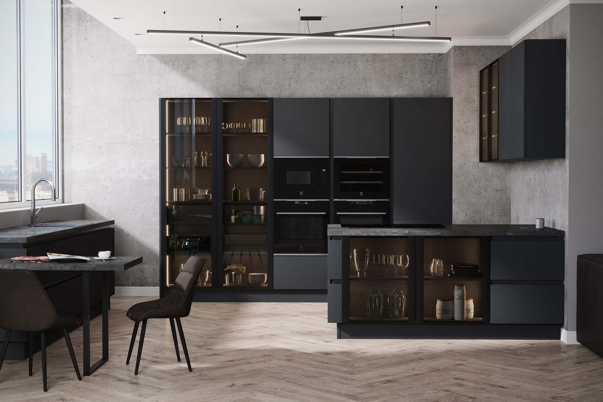 • В черной кухне нужно много света. Это необходимо, потому что черный цвет его поглощает. Таким образом, чем больше источников света, тем лучше.